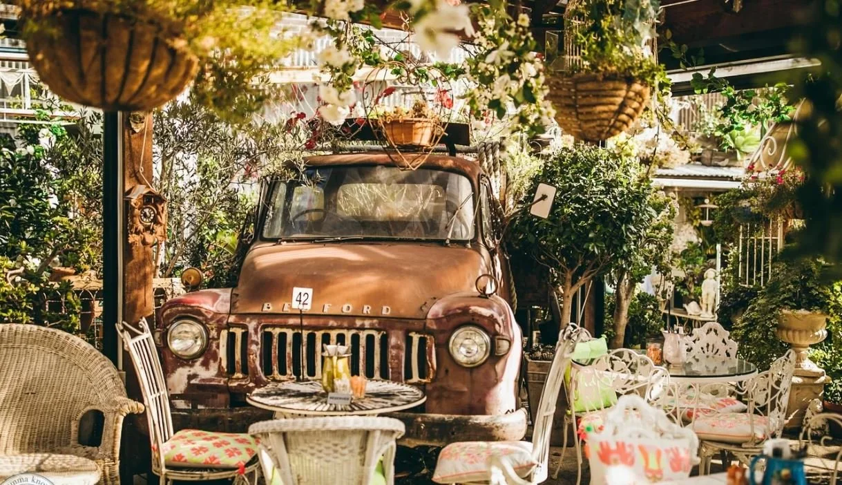 Old Man Drew (named after WW1 veteran and the Drew family patriarch Victor Harold Drew) takes you back in time to another era with its stunning lush vintage courtyard full of flowers, veggie patch, vine covered arbours, ornaments, greenery…and an old Bedford truck of course!