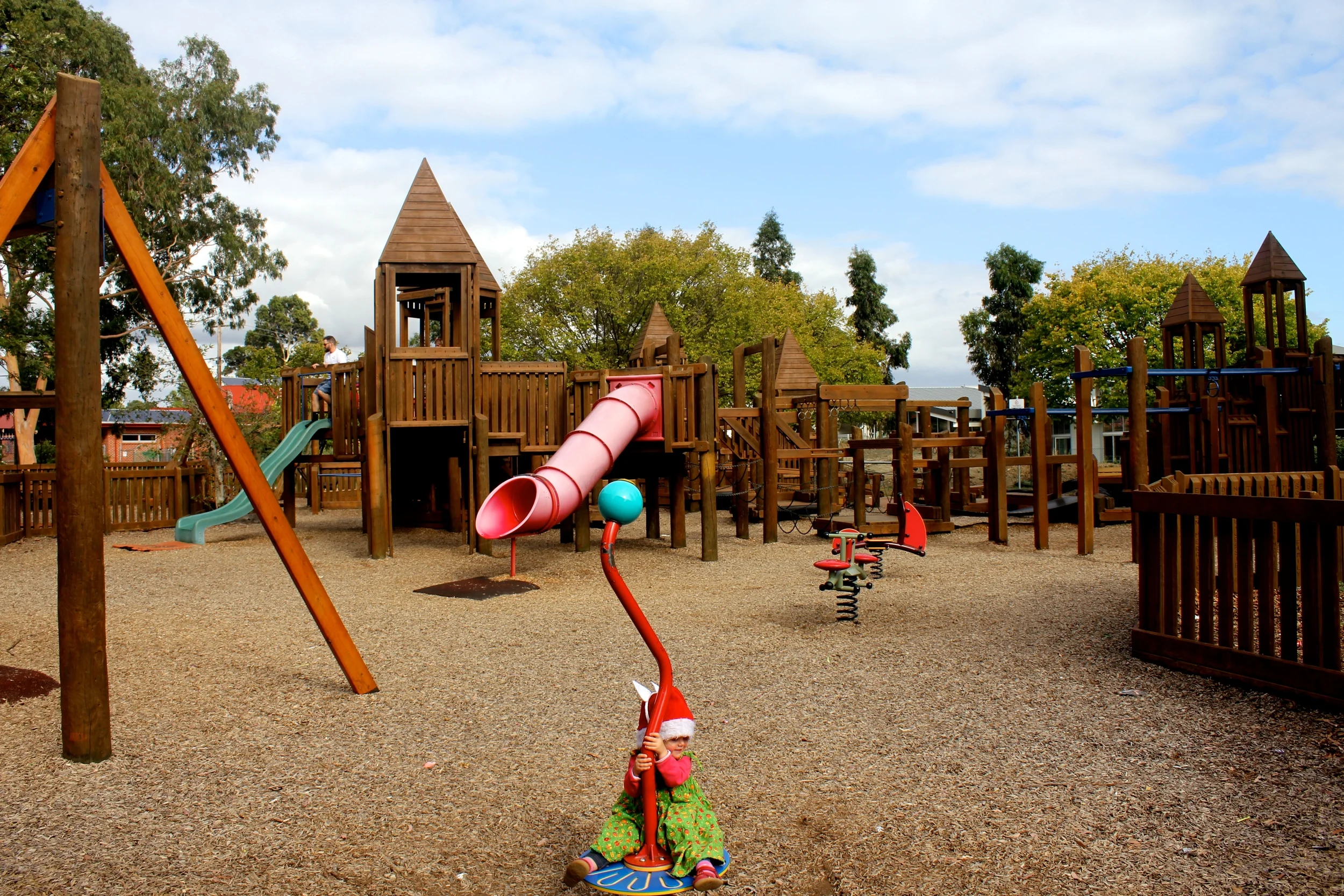 The majority of this playground is fenced in making it easier to keep track of the crew and Mamma says bright clothing is a good idea so you can see the little ones inside all the nooks and crannies of this structure.